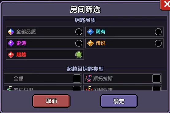 在这个界面里,勇者们可以筛选钥匙难度、钥匙词缀类型、钥匙品质等。筛选超越级钥匙的时候,还可以进一步筛选具体类型的钥匙。