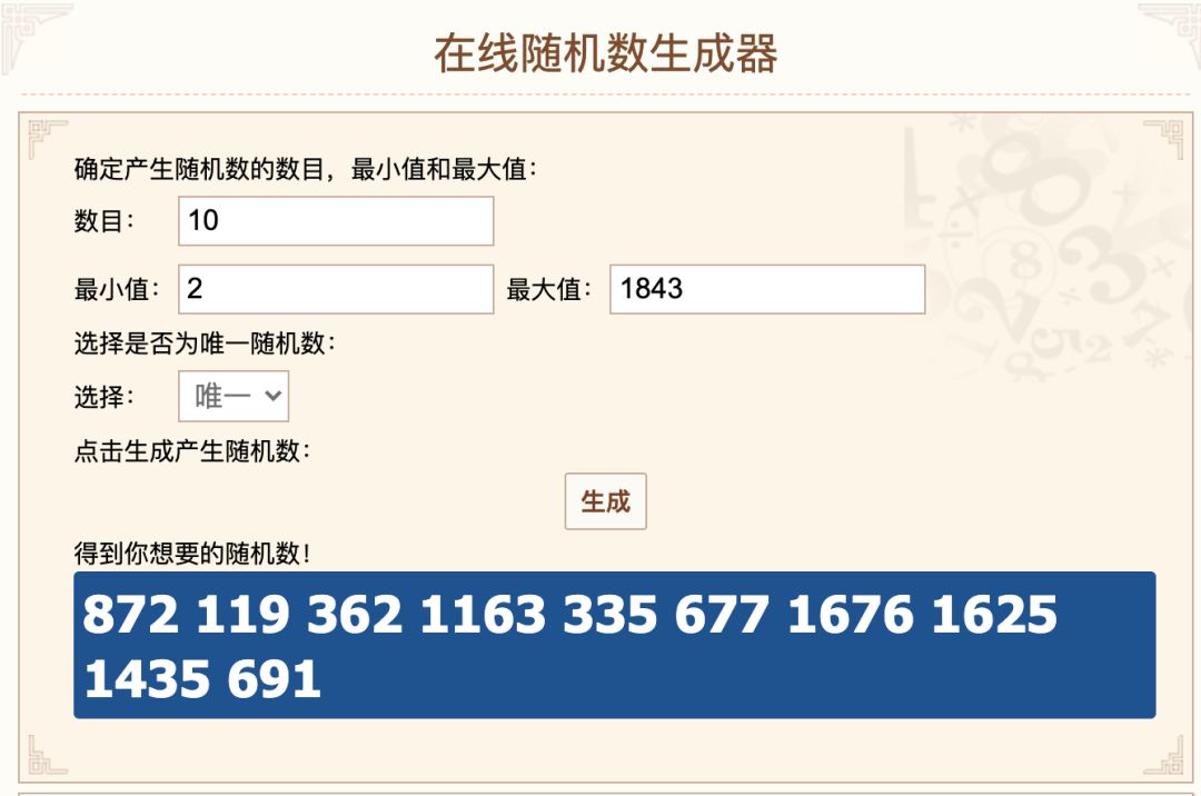 感谢各位的积极参与,此次参与抽奖玩家所在的楼层是2楼到1843楼,利用随机数生成器抽取的幸运玩家楼层数如下图所示: