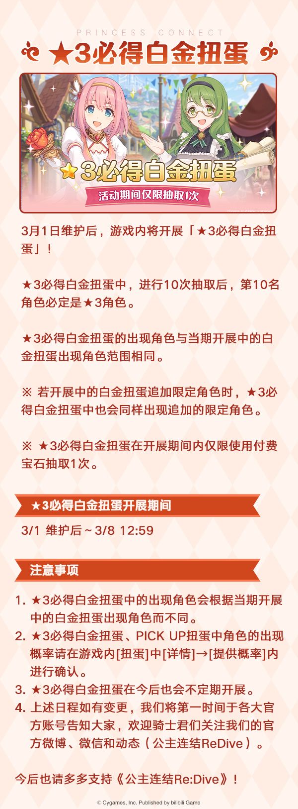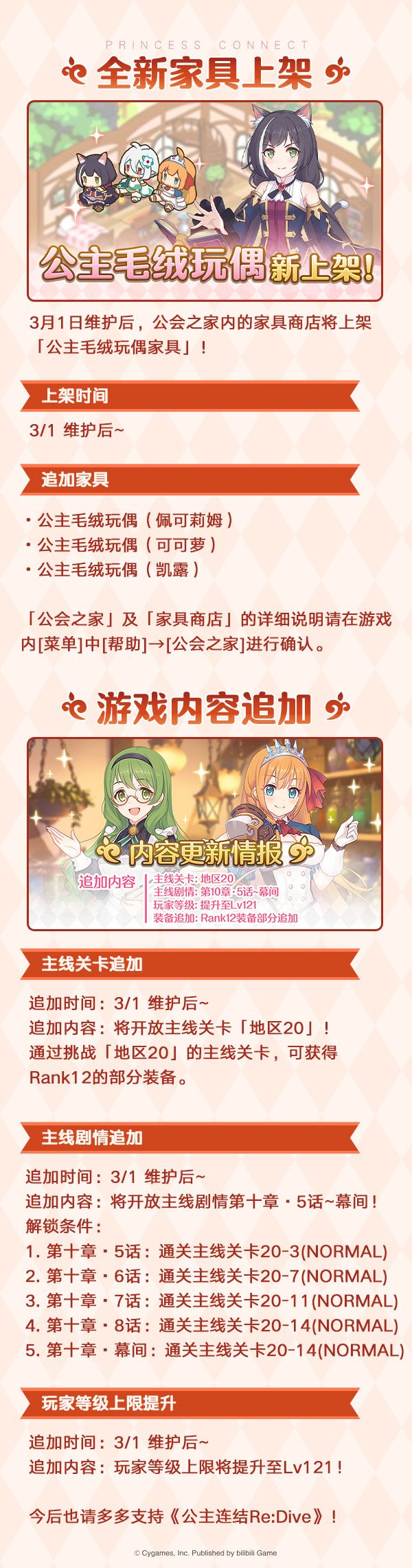 更新结束后,游戏内将开展★3角色出现率2倍的「公主庆典扭蛋」,公主庆典限定角色★3「矛依未」(CV:潘惠美)及★3「克莉丝提娜」将在「公主庆典扭蛋」中限时登场;同时,游戏内将开启「★3必得白金扭蛋」;公会之家将上架公主毛绒玩具家具;还将追加新的游戏内容!