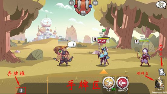普通卡牌在使用后进入最左侧的弃牌堆,弃牌堆的数字代表其中的卡牌数量,等到抽牌区没有牌时,会把弃牌堆的牌打乱顺序重新放入抽牌堆构成一个循环。