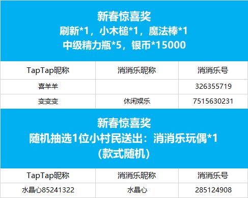 参与活动的有效评论每达到20个,随机抽选1位小村民获得:刷新*1,小木槌*1,魔法棒*1,中级精力瓶*5,银币*15000,并随机抽选1位小村民送出:消消乐玩偶*1(款式随机)