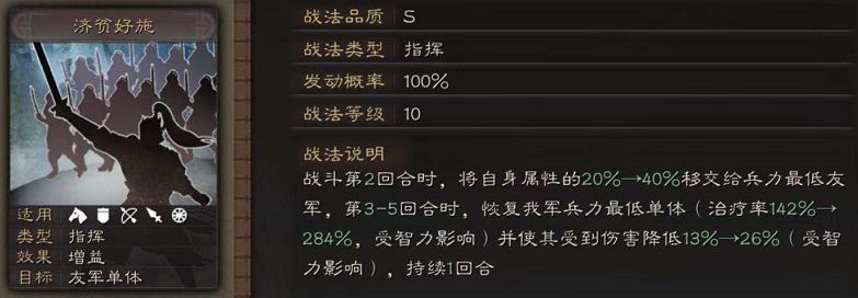 1.鲁肃自身的超低属性,尤其在面对兵刃输出的队伍时,极可能导致第3回合的治疗及减伤挂给自己,而4-5回合也有大概率挂给自己,换句话说如果都挂给了做辅助的自己,那鲁肃的作用就变成了仅移交属性,这个就十分尴尬了,带一个鲁肃还不如带一个夺魂挟魄和另一个四维强壮的武将如赵云。那如果要突出带鲁肃的意义,最理想的应当是辅助挂减伤治疗buff给主力输出武将,全力减少主力武将的损失及即将到来的损失。因此控制最低血量显得尤为重要,直接改变最低血量武将的手段只有战法:刮骨疗毒;间接控制的手段可以是用嘲讽、“给最低血量武将减伤:兵书援其必攻等、鲁肃战法本身也有这种效果”来稍加矫正,毕竟鲁肃的智力即使移交了也还够看,智力导致的鲁肃兵力最低由第三回合的济贫好施来逆转应该问题不大,而统率极低导致的兵力差可能难以通过单次的济贫好施来逆转,那只能再辅以减少受到的兵刃输出来间接影响了。