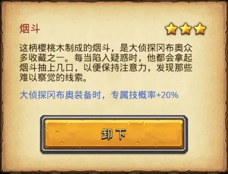 出战时,初始携带【烟斗】最爱的尼古丁刺激大侦探冈布奥提神醒脑专属技能发动概率直彪100%!