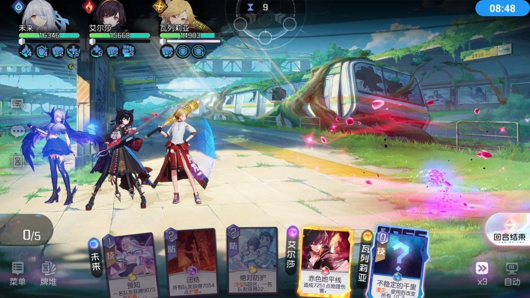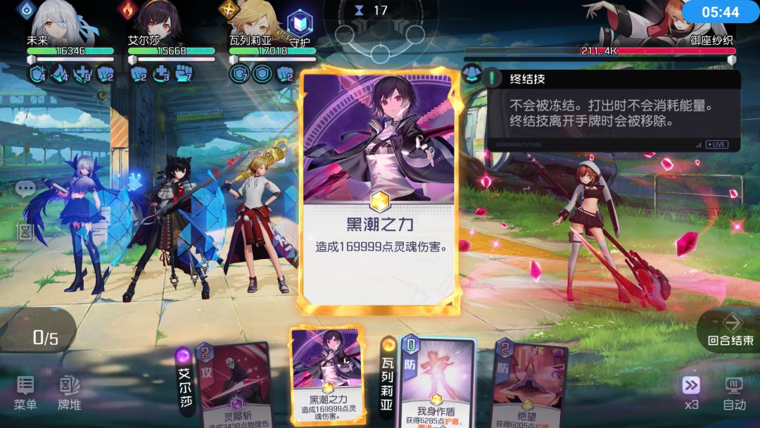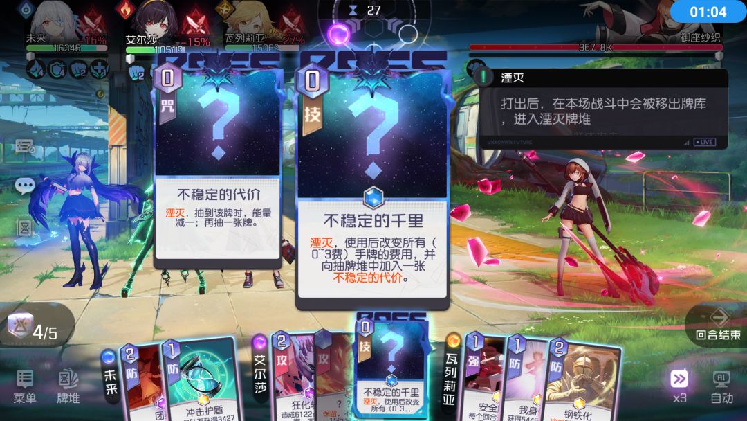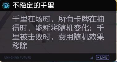 插播小技巧:手牌中有不稳定的千里时,优先使用低耗卡牌,尽量打出终结技。之后使用不稳定的千里后有概率使卡牌降耗,可以再打一波伤害。