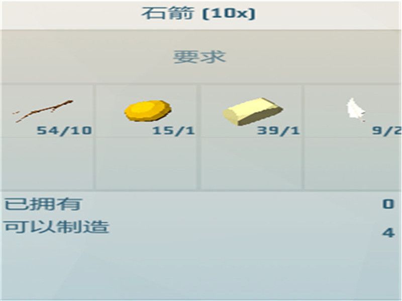石箭制作所需材料:x10木棍、x1树脂、x1燧石、x2羽毛