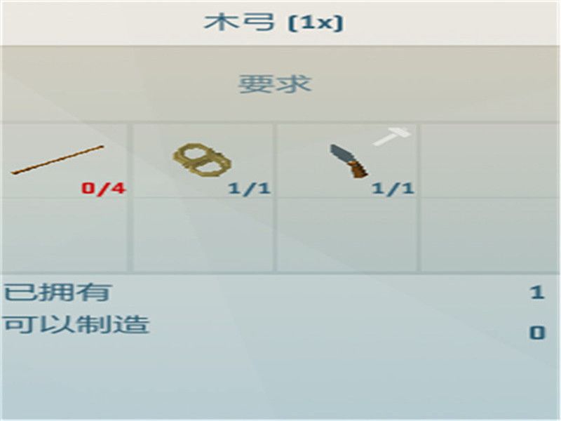 木弓制作所需材料:x4木杆、x1绳子、x1任何刀