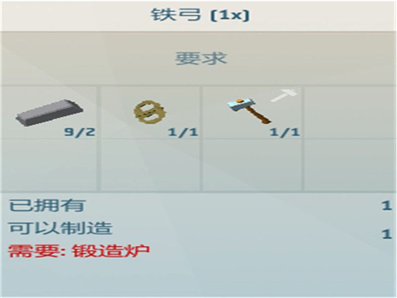铁弓制作所需材料:x2铁锭、x1绳子、x1任意锤子