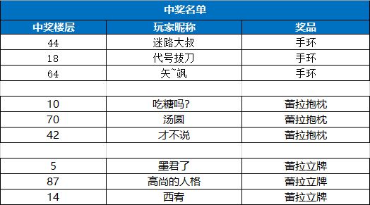从符合活动留言的楼层中,随机抽三人送出手环*1、随机抽三人送出蕾拉抱枕*1,随机抽三人送出【蕾拉立牌】*1