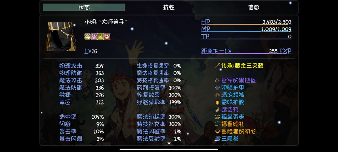 你看看,这像话吗?这也太强了,我记得我老档的小明30级都没那么高的攻击力(当然,因为我是龙虎山的法师嘛),就算不说小明,我当时35级坤坤(枪神,至于为什么不是水龙,那都是因为开局没打过武道大会,还存档了)也才450左右。那也是因为有武僧套的啊,总之一句话,小明46级版本真的就崛起了呗!
