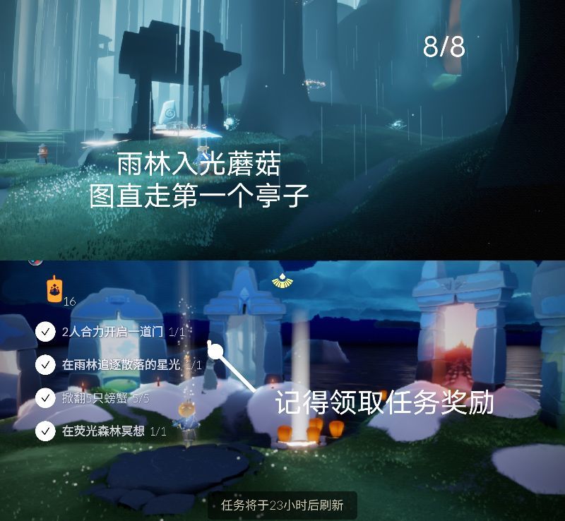 1.在云野三塔图找任意双人门,和好友或者偶遇其他光之子一起开门