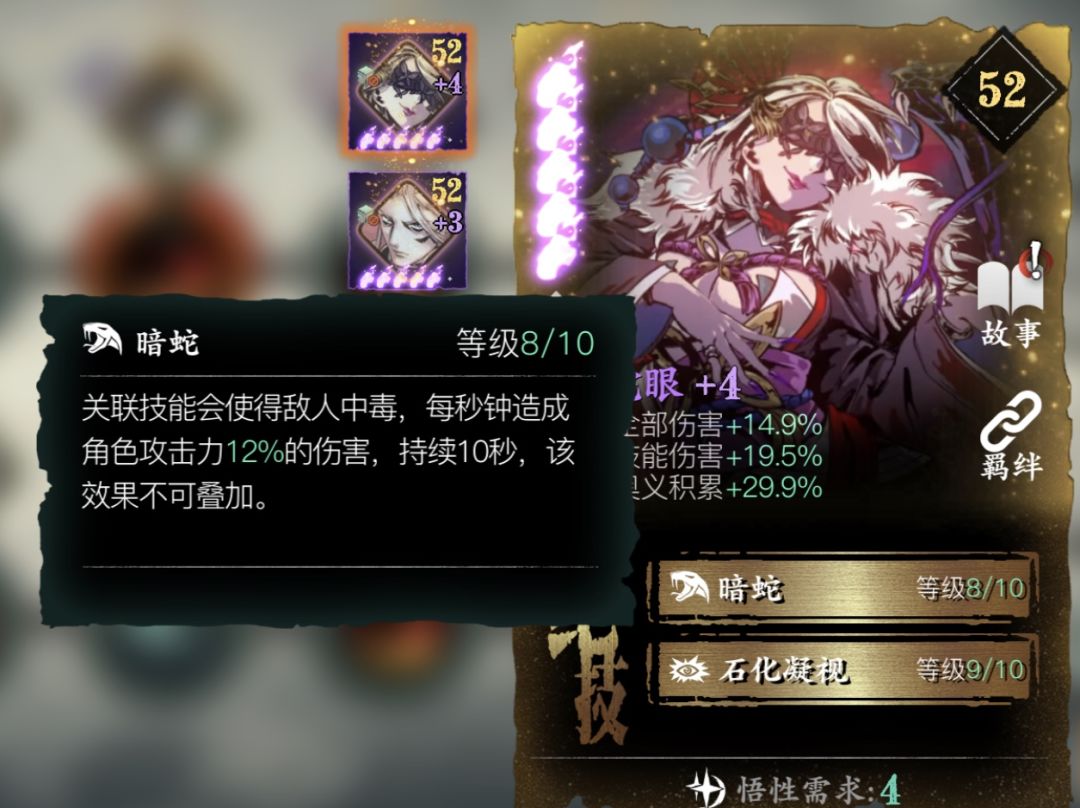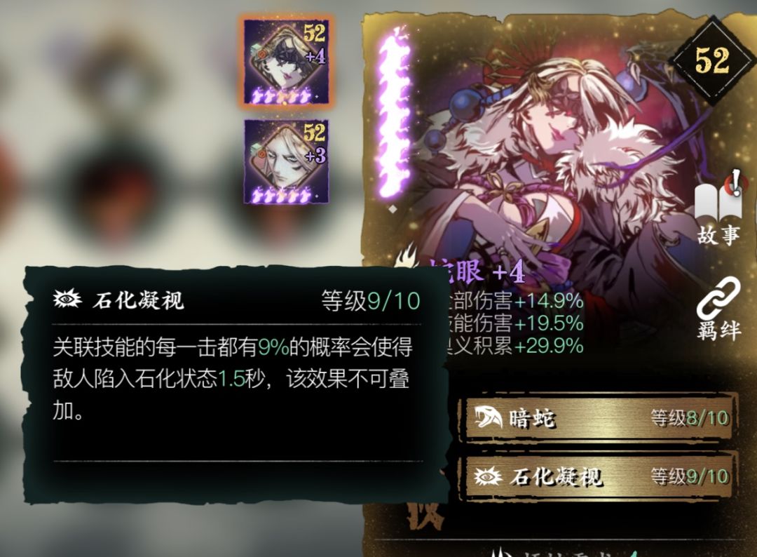 蛇眼放置于百裂雨杀是因为绝技1可以造成中毒状态,在另一个套装真假龙4中搭配钻心戒的独立增伤可以极大提高输出,同时百裂雨杀为五次范围攻击,实际石化触发几率并不低。技能伤害的加成可以在面对人形怪时嘬一口直接拉满状态。