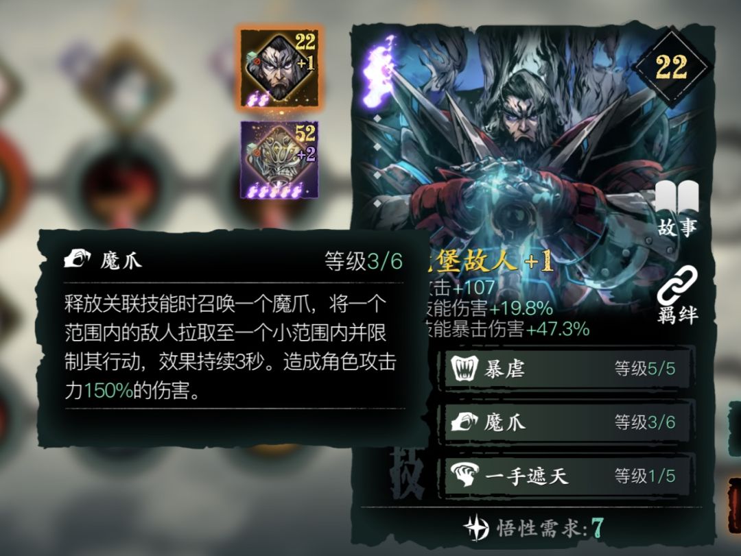 最后觉醒大棒子必然是上万魔,最强单卡名不虚传,只可惜我脸不好差一张2火触发霸体,霸体对于没有任何减伤防控机制的觉醒技来说属实是一个非常好的选择,在后续魔家后裔等级提升之后可以往前替换以加强整条链输出,但是个人建议如果绝技三不是等级很高,建议火刀还是留在觉醒技上。绝技一加面板爆伤,作为一个吃爆率爆伤的职业来说是很不错的,绝技二魔化后直接攻击、防御加成30%,这个是面板直接增加,在各种增伤中显得弥足珍贵,同时就紫1的3s来说刚好足够大棍子蓄力成大白棍子完成最大伤害输出。