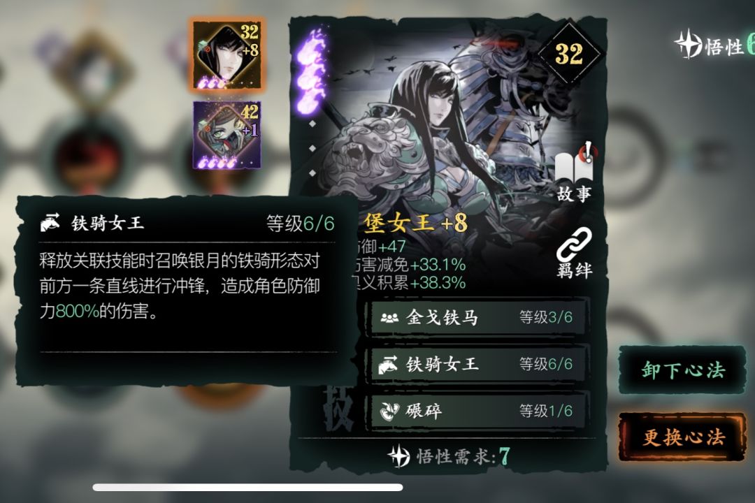 起手技能烈焰突袭搭配女王心法可以做到直线范围内的护甲必破和真伤输出,为之后技能衔接做准备。绝技2搭配憨憨撞击视觉效果拉满,毕竟得帅,绝技3是核心技能,40sCD的必定破甲和护甲损耗及真伤伤害,搭配烈焰突袭本身真伤十分合适,同时大范围的破甲使得攻击效率提高很多,缺点在于绝技3冷却时间偏长长达40s。在这里跟另一张防御强势单卡永铭之志进行对比并说明我取舍的原因。