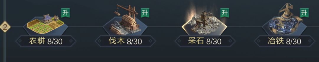 升级农耕\伐木\采石\冶铁可提升粮食\木材\石料\铁矿产量。若领地粮食\木材\石料\铁矿超过容量上限会停止粮食\木材\石料\铁矿产出。