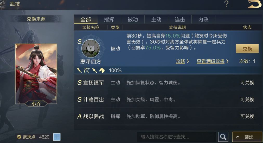 如果想找单个武将可以兑换什么武技,可以直接在【武将】页面找到【兑换】,即可查看该武将可以兑换何种武技了。