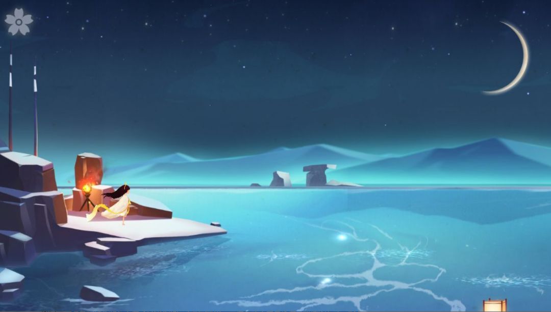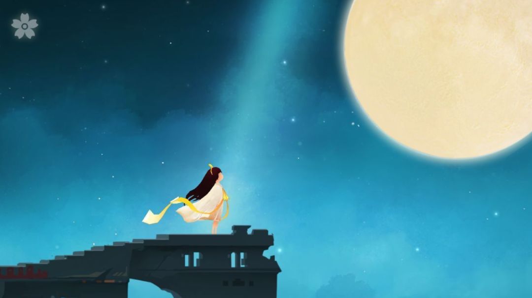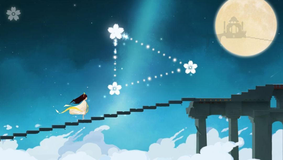 相对于玩法游戏画面才是最值得一说的。繁星点于星空,圆月高挂,夜色总是无声,黑发女孩着白裙行于云上之阶梯,裙角随风飘扬,美丽而空灵。虽然建筑、人物这样的设计都很容易让人想起《纪念碑谷》,但玩法、意境却有很大不同,甚至更能用画面触动人心。