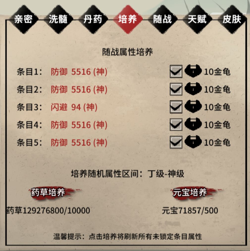 (1)侠客培养玩法调整,药草随机获得属性最高提升到神级,改成同时培养5条属性,可使用金龟锁定属性的方式,全神不再难!