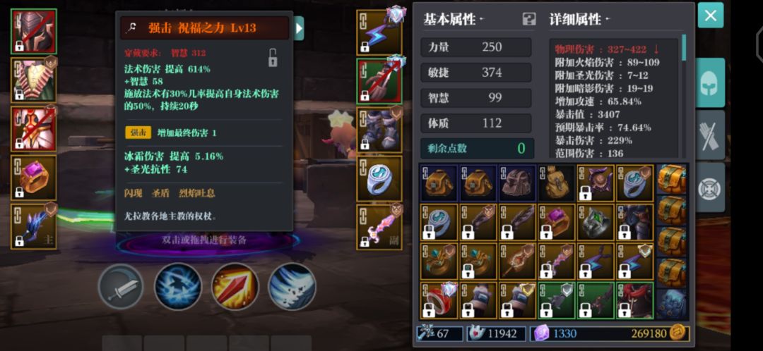装备任意等级的祝福之杖,平A几下获取50%法伤增幅buff,然后换双刀,开祝融,你至少可以收益600以法伤,转为附火接近400点,相对来说轮3000血加的200法伤不足以论,至于属性狗粮,你用20个词条换400附火都是划算的