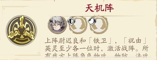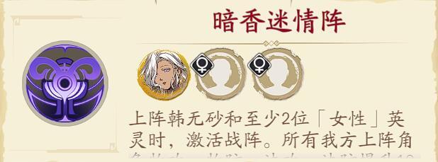 作为一名万金油的绝品奶妈可以加入到任何队伍和战阵之中,当然相比男性祝由,封铃笙更适合作为韩无砂的【暗香迷情阵】的一员,如果是男性祝由要触发韩无砂的战阵就限制了除了自己之外只能再上阵一名1名男性英灵,而女性祝由的封铃笙可以保证让【暗香迷情阵】还能上2名男性成员。