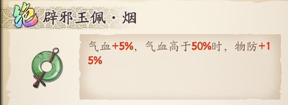 最适合衣服的饰品当属这枚气血+5%,气血高于50%时增加15%物防的绝品【碧血玉佩】,在对抗物理攻击时作用明显。