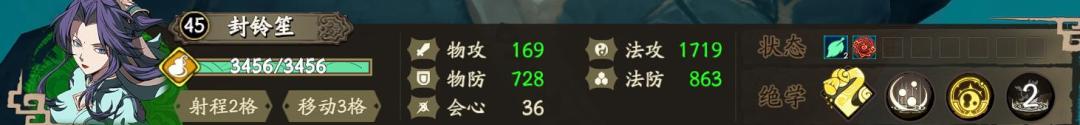 如图:封铃笙作为奶妈在满血的时候不但有较好的法攻值面板,血量和双防同样优秀。