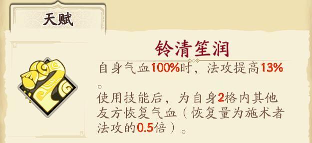 当封铃笙未受伤害100%满血的时候会获得额外提高的法攻百分比加成,这时给队友治疗的加血量也会更多。封铃笙每次使用任意技能后都能在自身周围2格范围内产生一个被动范围回血。满血时的法攻加成+使用技能后的天赋额外范围治疗+主动治疗技能的产生效果可以让封铃笙不管是单体治疗还是群体治疗都有很高的奶量。