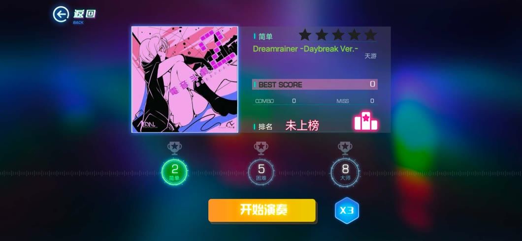 点击后的界面如下图所示,在这个界面中达人们可以自行选择X1-X5的倍速哦,当然难度也是从“简单-困难-大师”逐级递增的啦!点击“开始演奏”并对旁边的速度按钮进行调整之后就可以开启专属于你的音乐之旅啦♪~