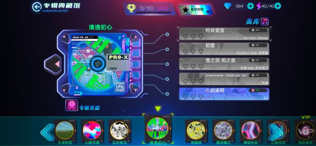 进入【典藏馆】后即可到达专辑选择环节,有“清透初心”“破碎粒子”“声系次元”等15张不同风格的专辑,每张专辑中各有5首曲目供达人选择。