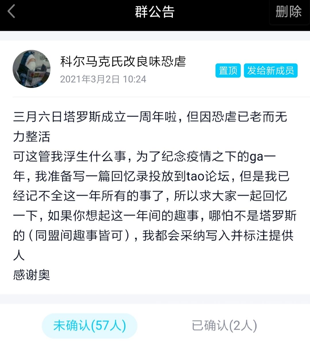 眼瞅就要三月六号了,就要到塔罗斯成立一周年了,作为一个萌新团坚持到现在,还是挺不容易的。看着行星列表里一列264的星球,成员列表里一列百日未上线的员工,有点小感慨,遂在此记录一篇。