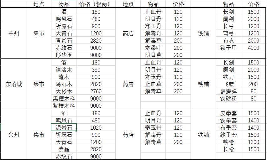 各城市集市药店铁铺出售物品
