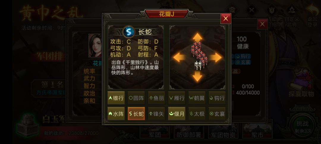 解决方案1,继续削圆阵,把防御削下来,其他几个阵法,双A近战防御,近战攻击的顺手也削一下,这次只砍了圆阵,下次活动双A防御的阵法,偃月乌龟阵,玄囊乌龟阵,鹤翼乌龟阵,只要防御够高,会戒备金刚的武将去带,为何不能乌龟???😏😏😏