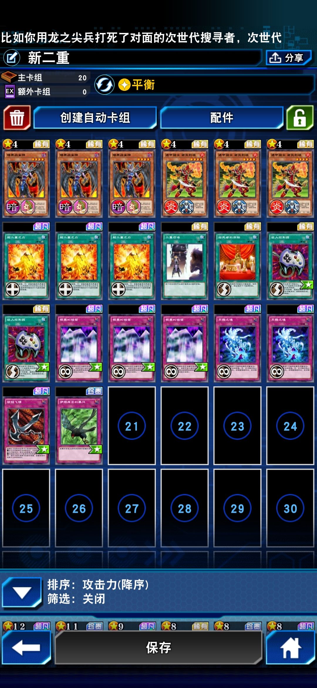 用的二重卡组,不得不说带平衡的二重是真的强,除了三张超二重,魔法卡和陷阱卡选择很广,推荐带镜反、控制器、伊塔库亚的暴风、死者的供物。我看还有些人带天罚,个人感觉天罚再抛张卡破坏对面有点亏,二换一。