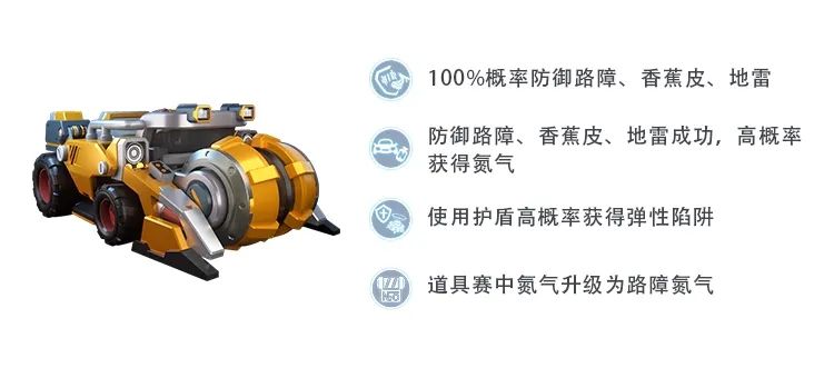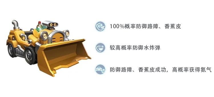 推土机可以直接无视路障和香蕉皮的干扰,并且在防御这类地面障碍成功后还能高概率获得氮气,让对手的阻挠变成前进的动力!