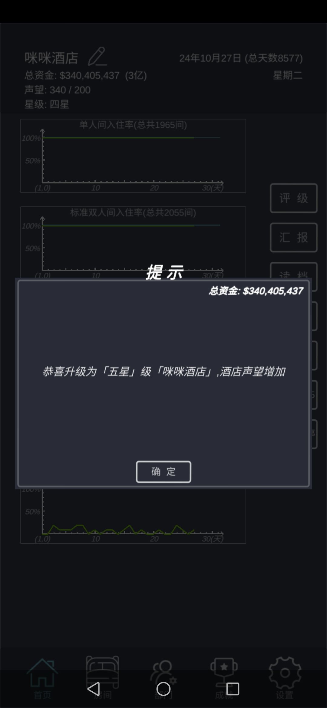 到了5星,总统套房一下子就住满了,10个总统套房就有700万,其余房子500万,合计月赚1200万【图3】。继续建总统套房,多赚点钱。