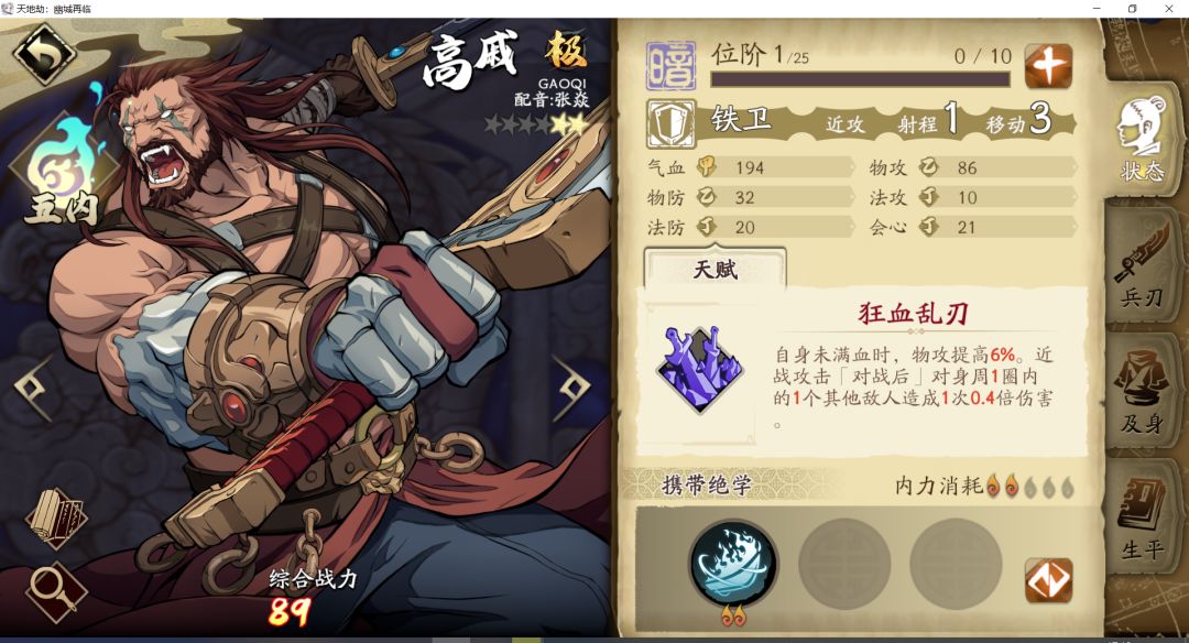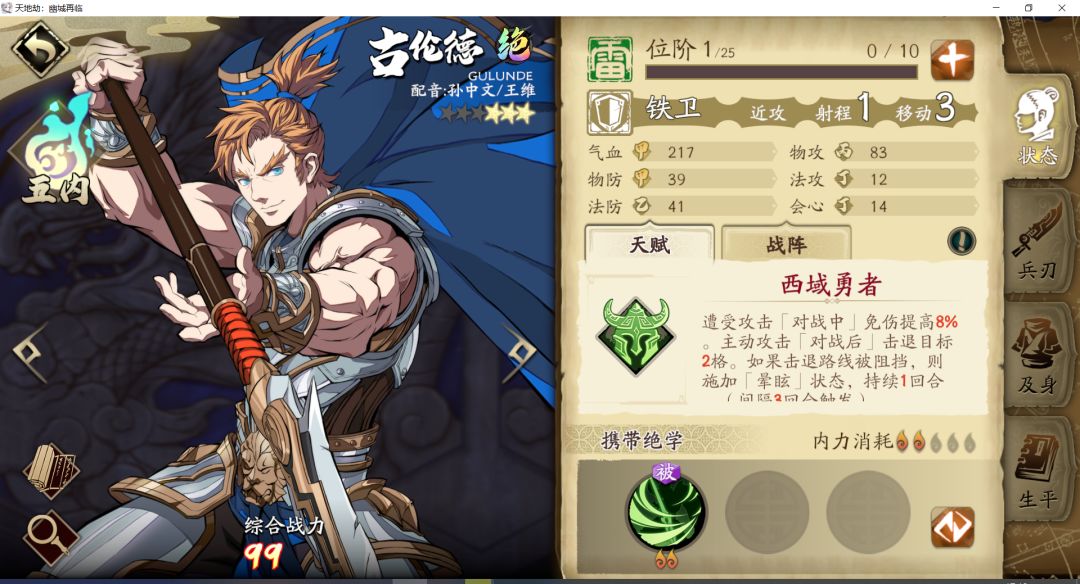 3. 高戚:主打单体伤害的斗战,爆发伤害很高且回复能力强。缺点还是吃了品级低,基础属性差点的亏。阵容用于血战队。实战使用类似侠客,可以用于boss战配合侠士打输出。boss战中不带其他盾战时,可以考虑让高戚带被动护卫,必要时当T承担一下伤害。但是由于缺乏减伤手段,持续承伤能力差,仅供应急。