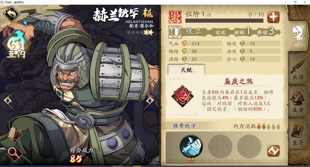4. 赫兰铁罕:反伤流盾战,特点是固定伤害反伤,适合慢慢磨高防御的硬骨头。同为炎属性盾战,和鹿昭依相比,赫兰铁罕的纯粹硬度会更高但是回复能力是自身行动后,这点不如能即时生效的鹿昭依,适合配合祝由的愈合使用。