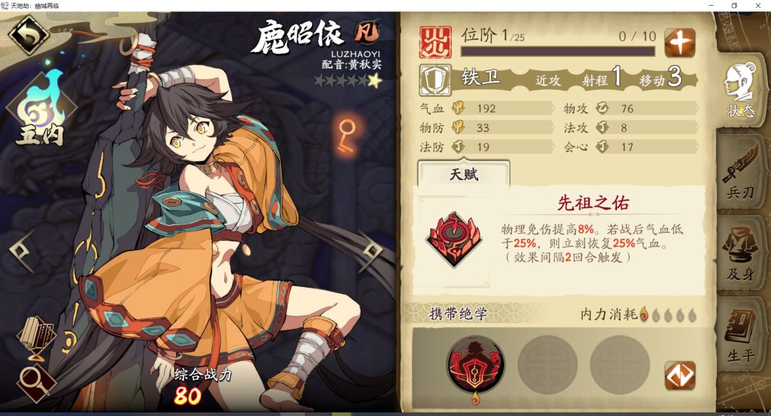 2. 鹿昭依:纯粹的盾战,常规减伤(天赋+流火缀甲:25%)最高的铁卫。非常规的古伦德天赋+无畏:35%减伤,解臾龙焰化鳞:30%物理减伤,都是一回合1次。回复方面,鹿昭依天赋半血以下可以回复25%气血。所以,她一回合能承受多次伤害。输出能力方面,中等偏下,主要靠反击伤害增加的buff和流火缀甲的燃烧固伤。实战使用中,除了盾战本职的开怪外,流火缀甲的燃烧可以配合夏侯仪,打出更高伤害。鹿昭依是初始3主角之一,没有获取难度,就是养成初期较弱,需要一点耐心。魂石盾战通用咒石兵。