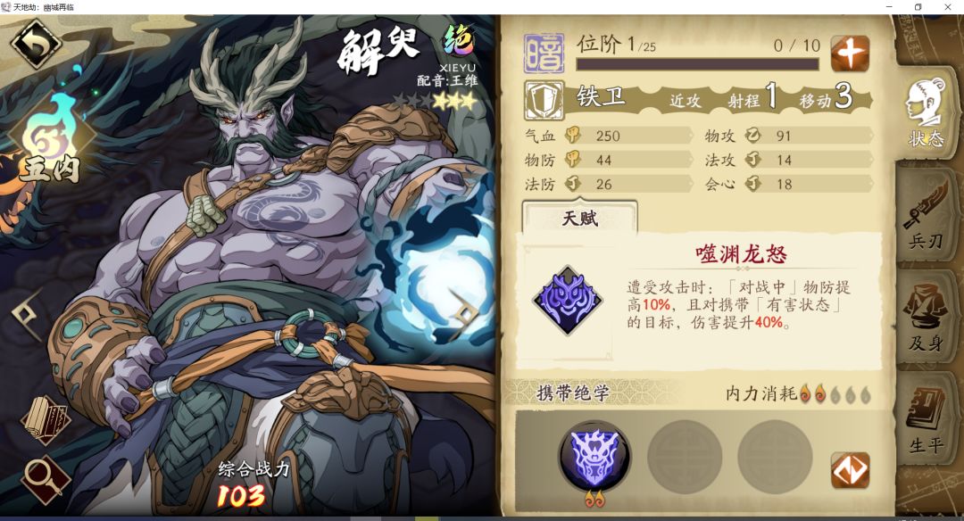 5. 解臾:主打高反击伤害,评价应为中等水平。黑龙的优点在于他的属性了,暗属性和单次高物理减伤+中等水准的伤害,在日常非光属性boss战中表现还算好。实际作为盾战,他不如前面几个,输出能力也比高戚差点。魂石用冰魔蝎,反正没啥持续承伤能力,不如一次性的超高防御。偏进攻可以用死魇鬼卒,boss战最后卖残血队友,靠黑龙反击苟过去。