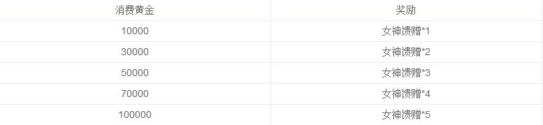 【活动内容】活动期间内,只要单日在游戏内消费黄金达到指定额度,即可获得不同数量的【女神馈赠】,可在活动结束后用于兑换奖励。