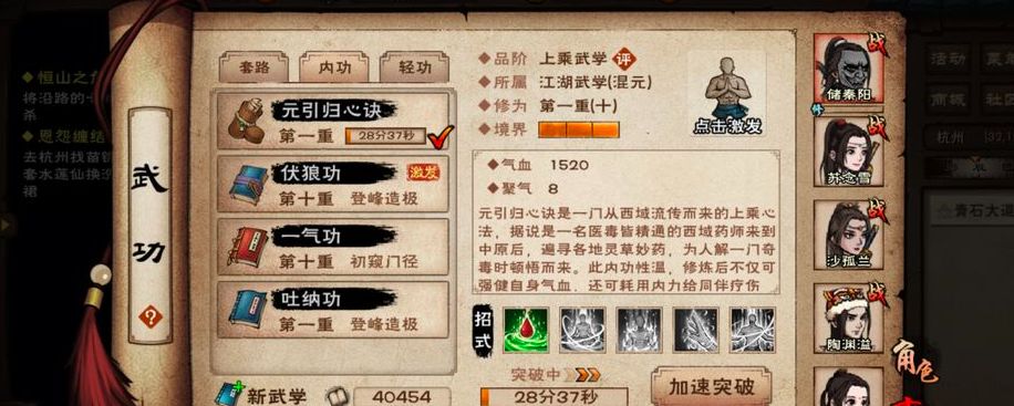 如果想要获得元引归心诀,想要先将主角的人物等级提升到60级,然后前往姑苏场景,找到"华十三"NPC进行对话后选择"元引归心诀"选项,接着在华十三讲述功法好处的期间,点击"请求传授"选项,回答华十三的三个问题,接取对应的功法任务,获取对应的材料后,就可以得知元引归心诀的对应地点,花费100两银子获得。
