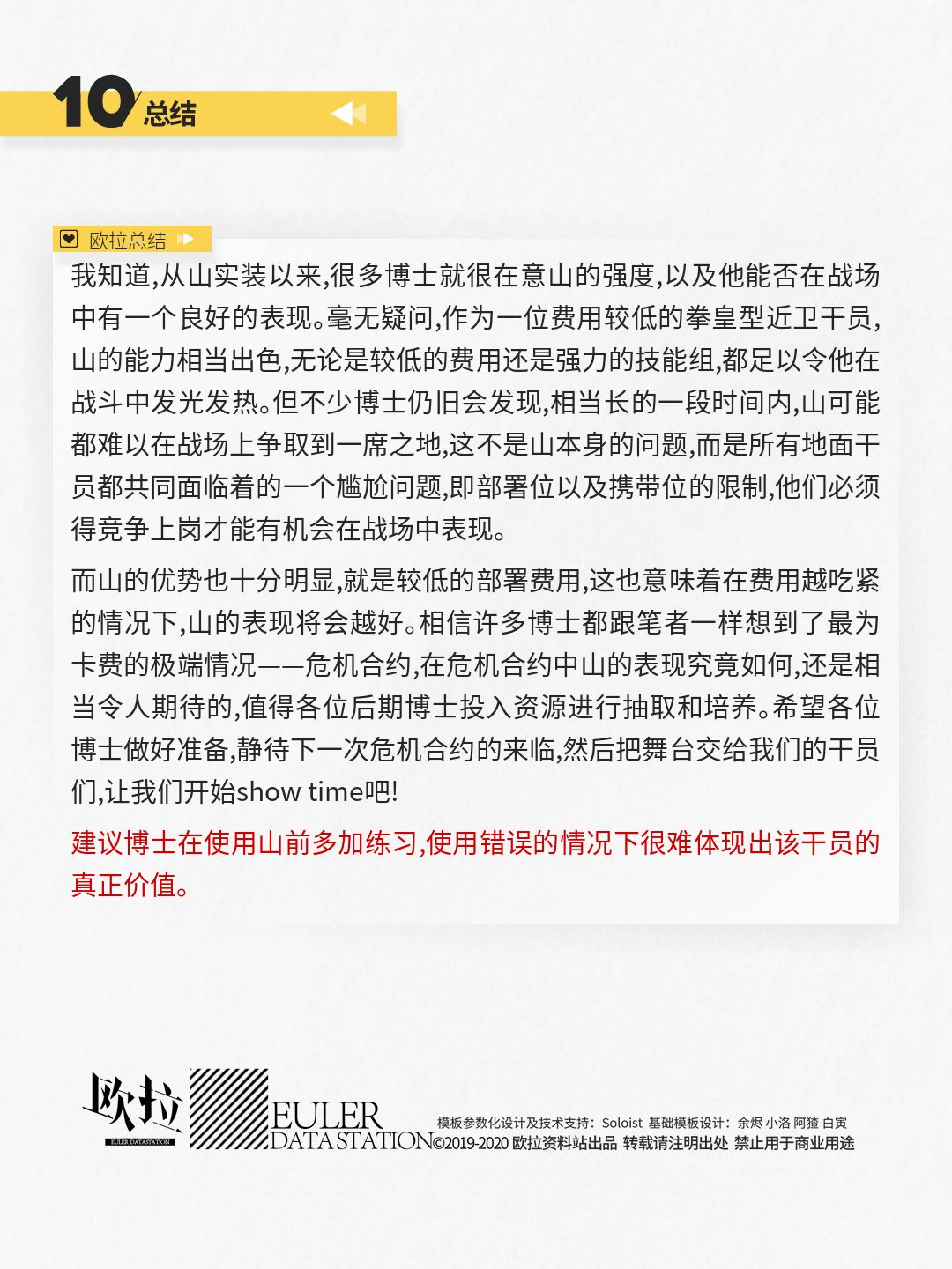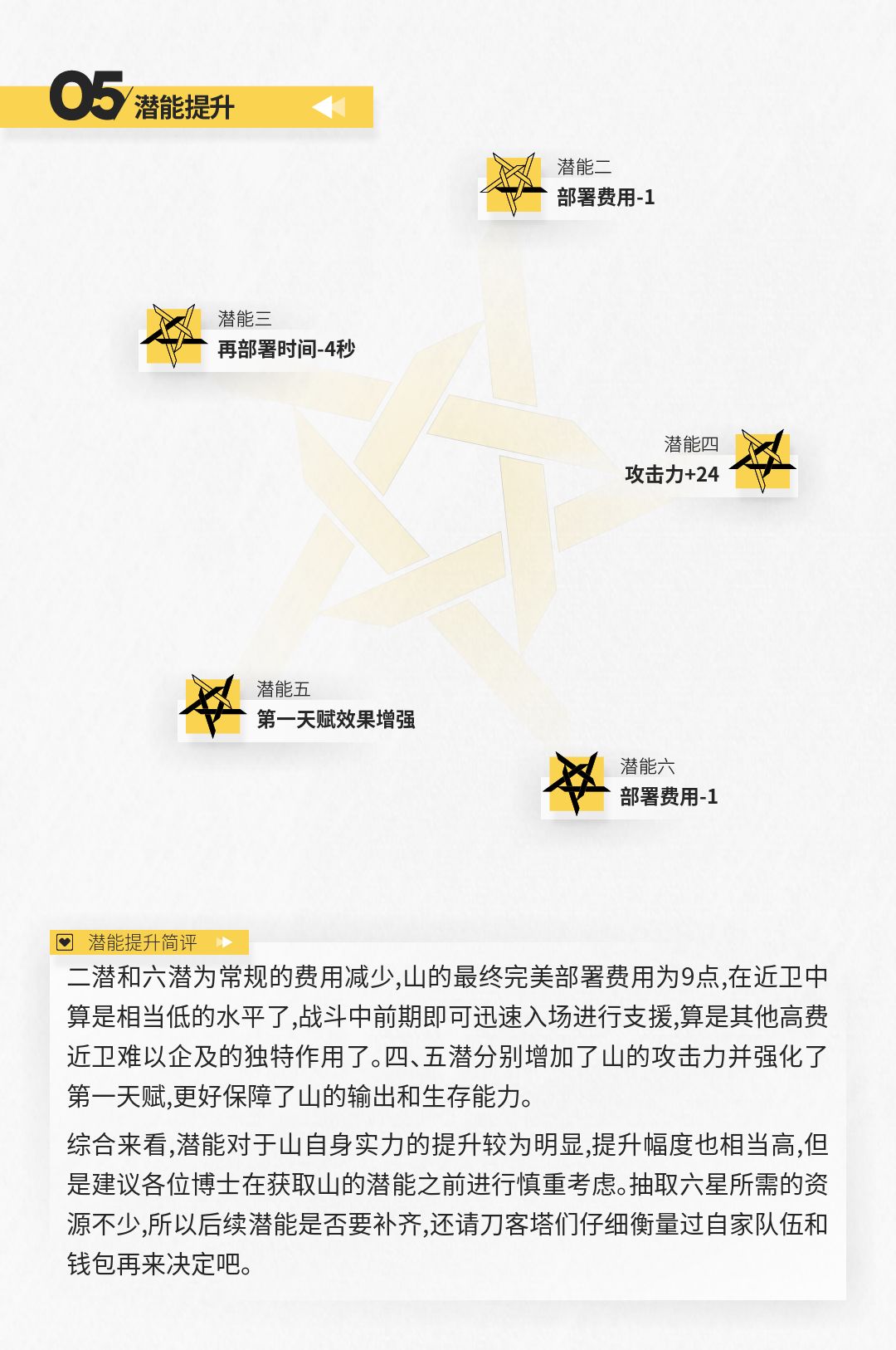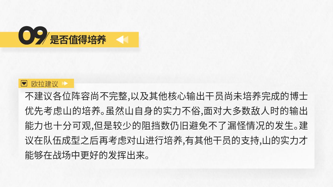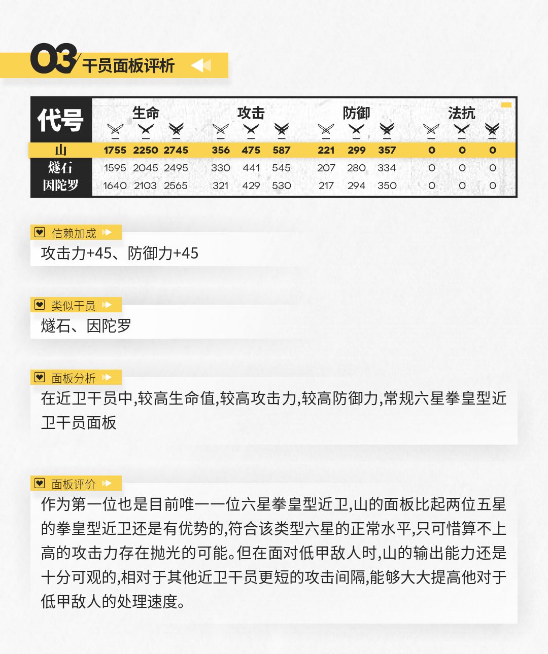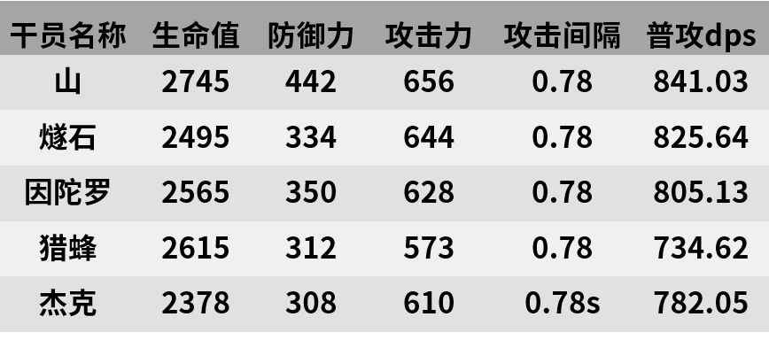 参考上表所示,山的面板数据还算可以,比两位五星干员强但并不明显。相比其他近卫干员,山的阻挡数太少,因而更加需要其他阻挡数较高干员的协助,他则更适合在侧方进行输出。