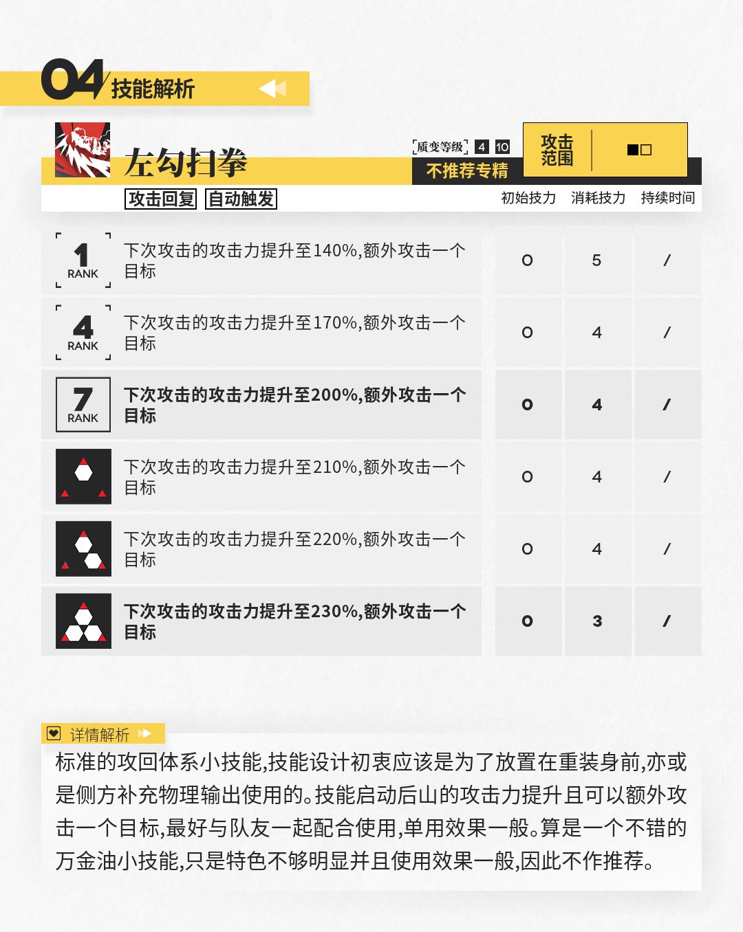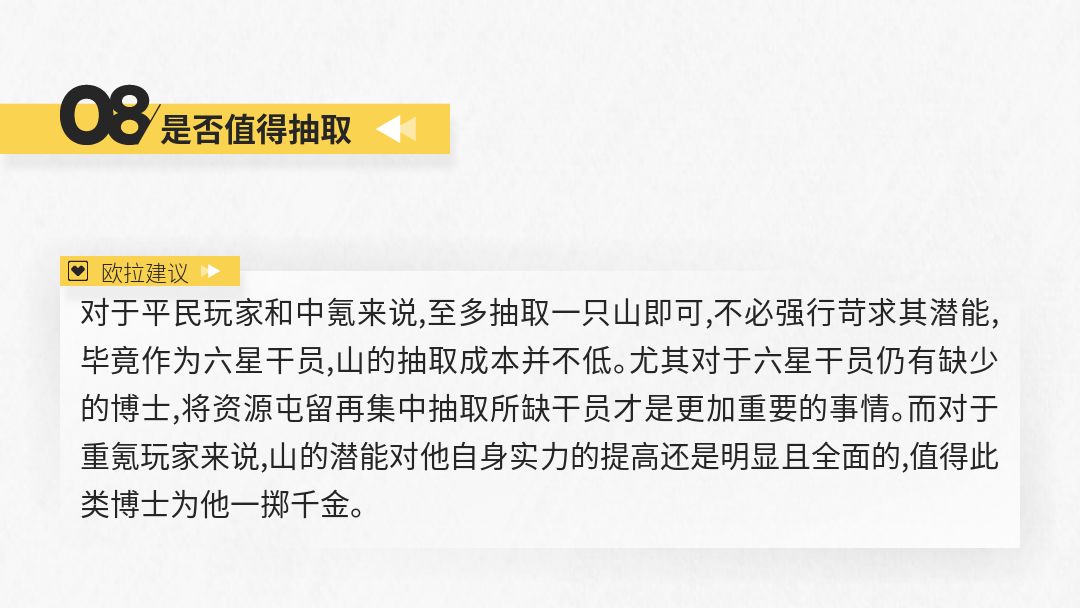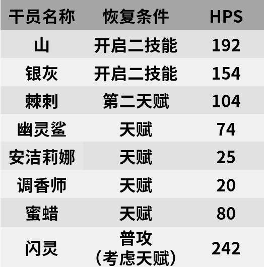 整体来看,二技能提供的回复效果还是相当出色的(技能自回hps接近于0.8个闪灵),基本能够抵消防御力下降给山生存能力造成的影响。而且输出能力和阻挡数可以得到一定的提升,无论是硬抗棘手敌人还是单守一路都能发挥作用。