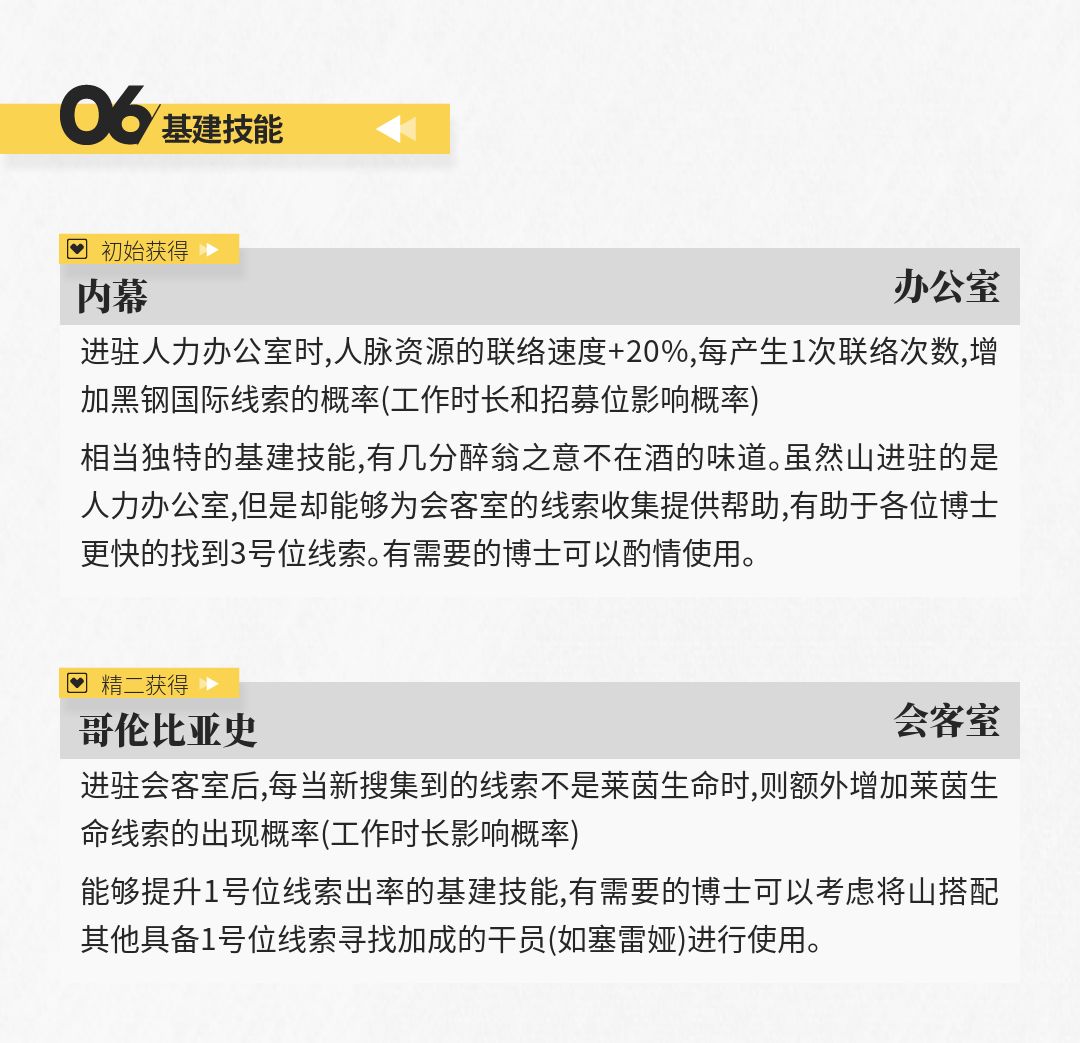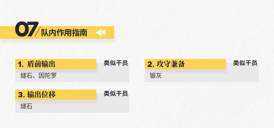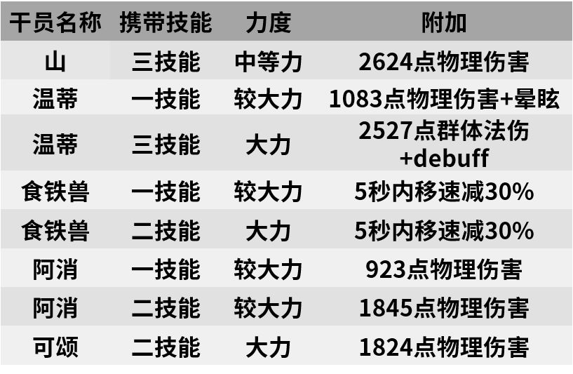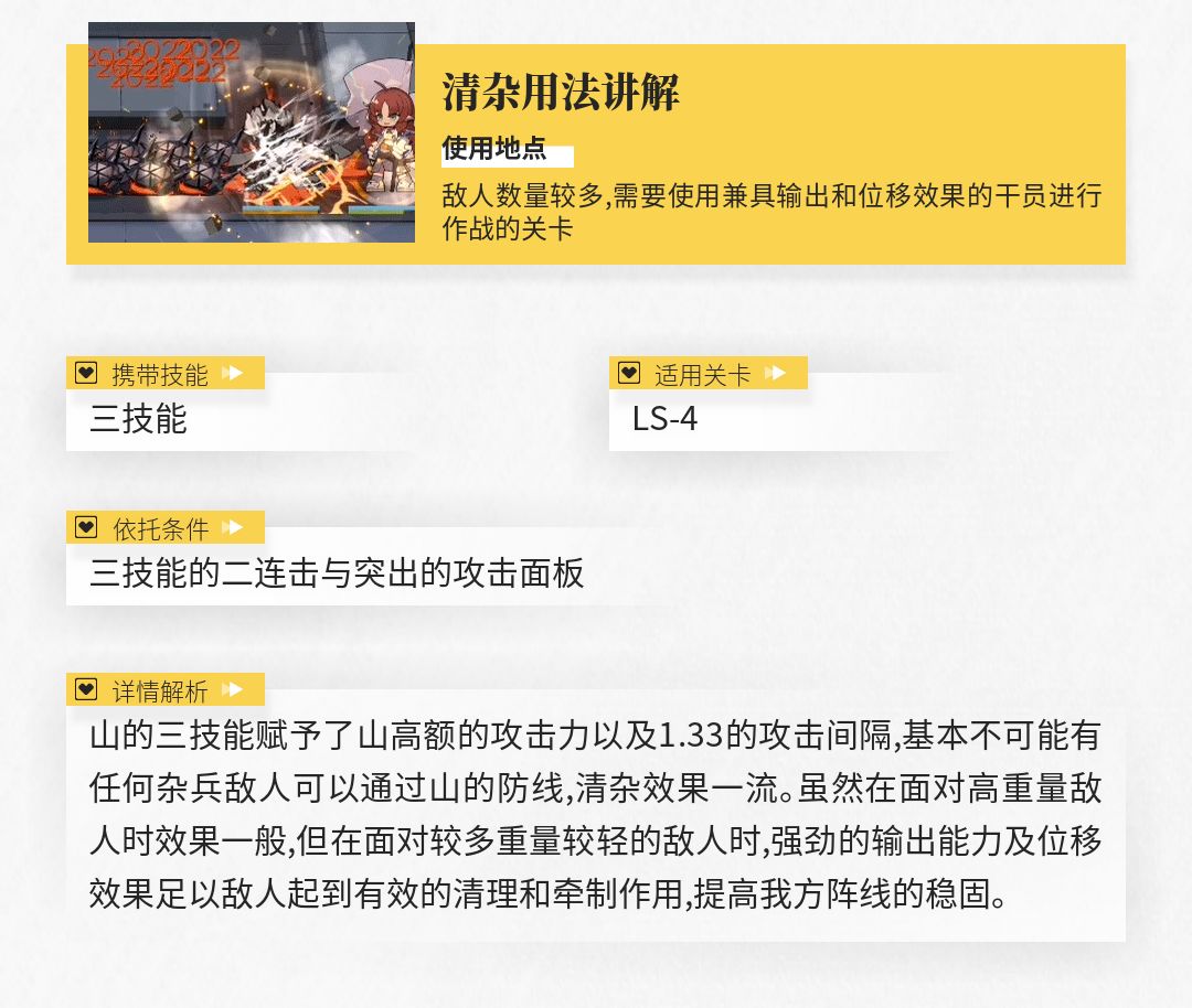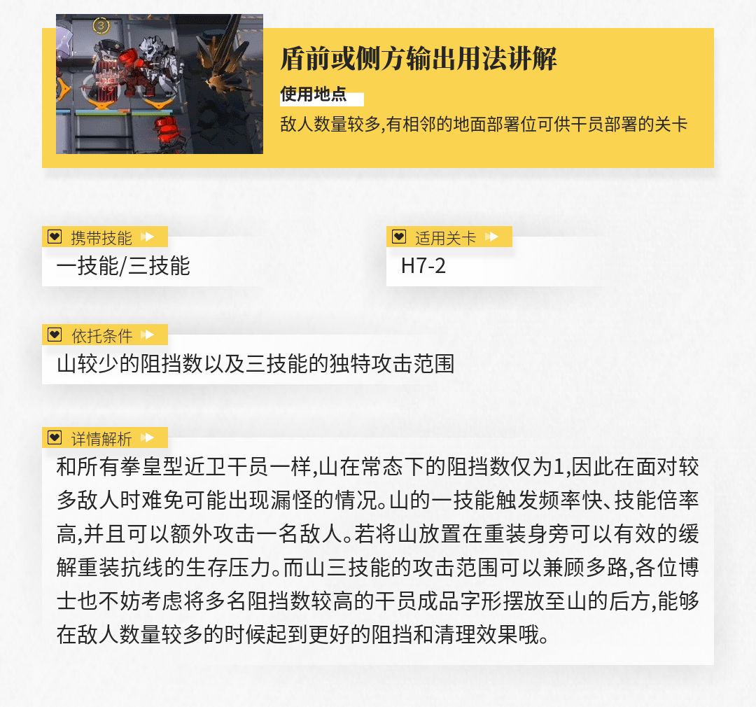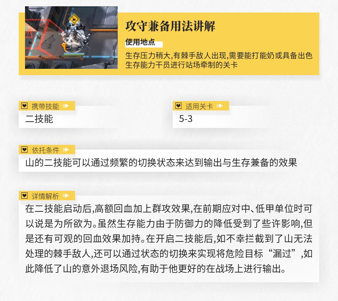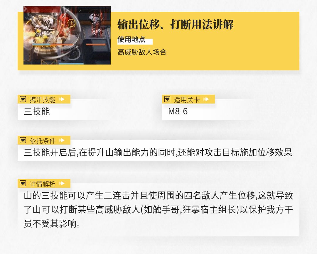 虽然相比其他专注于位移的特种干员,山的三技能所提供的位移效果并不算出色,但足以对大多数重量较轻的敌人起到击退的效果(如在应对狂暴宿主组长时,山就可以利用自身较短的攻击间隔对这类高危单位进行击退,将他们消灭于无形),有助于各位博士应对更多的复杂情况。