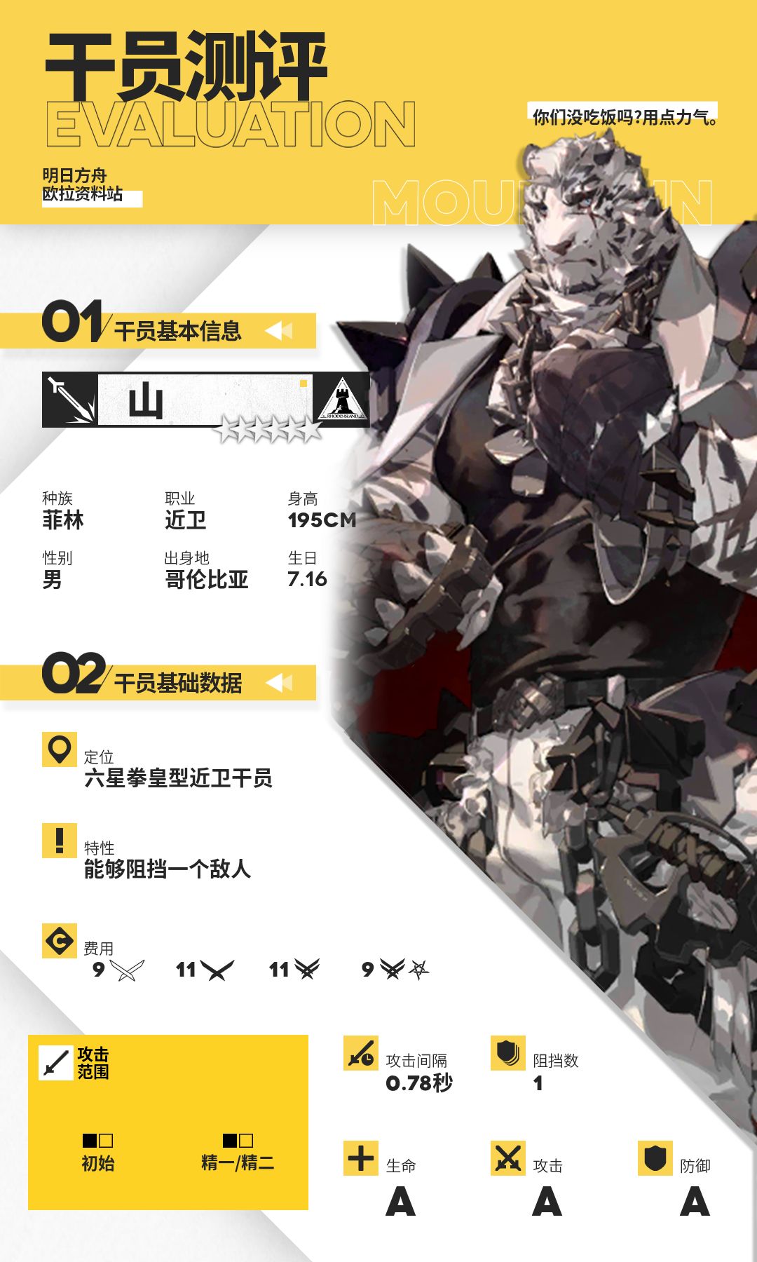 在监狱风云活动中,刀客塔们迎来了最弱boss杰斯顿同时也迎来了第一位拳皇型近卫。不少博士也对拳皇型近卫干员山有很高的关注,作为第一名六星拳皇型近卫干员,他的自身强度如何,又是否值得抽取和培养?希望通过这篇测评能让博士更加清楚地了解山,为日后更好的使用打下基础。