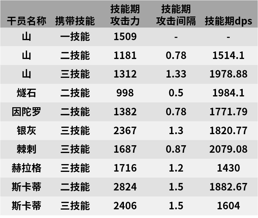 注:该模块的所有数值均为在干员精二满潜满级满专精的情况下计算。表格中所有数据所呈现的情况均为该干员的满配峰值情况,即满级、满潜、满信赖、满技能等级、满天赋加成。所有非100%概率触发的天赋不参与数值计算。所有光环类天赋仅对拥有该天赋的干员自身生效。