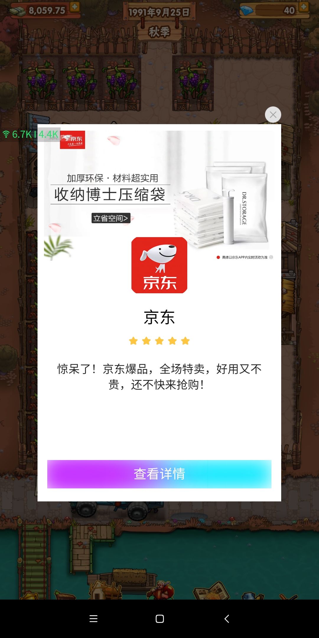 刚玩两天,很喜欢这个游戏,但是广告真的太多了,不一会靠着误点就给我下载了那么多东西。要不是我今天一看游戏信息居然有将近3个G,我还不在意。把联网权限掐了五分钟闪退一次五分钟闪退一次,很无奈,明明是一个单机游戏,却向手机要了那么多权限,真的是难受。虽然国内大环境就是这样,但是你也不用吃相那么难看吧,直接无脑弹窗,一星差评先给了,以后再改