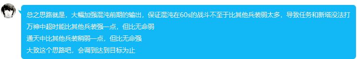 至于为什么本次为何会在上调前期伤害后下调超时后期伤害,混沌的机制本身在不同环境中差距较大,受时间关系也很严重,只能每次试探行的调整一点点,防止一次调整过度导致强度超纲,那样难道又以混沌的强度来调整其他兵装吗。