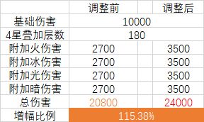 由上图可得到,总伤害因混沌风暴占比的下降,伤害只有更新前的87.5%,在0~3星增幅15%后,就能和更新前保持一致。