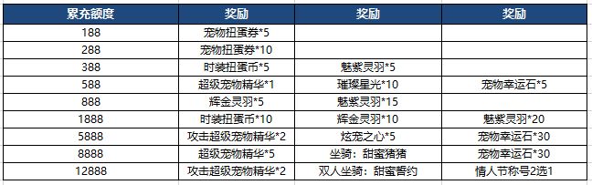 活动期间,累计充值额度达到指定条件即可领取丰富奖励。此次累充奖励包含情人节坐骑(甜蜜猪猪、甜蜜誓约)、情人节称号等稀有奖励!