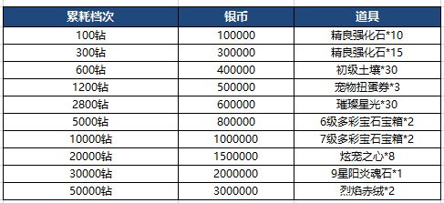 活动期间,累计消费达到特定档次即可获得丰厚的银币奖励以及道具奖励,其中包含9星阳炎魂石以及烈焰赤绒等稀有奖励!